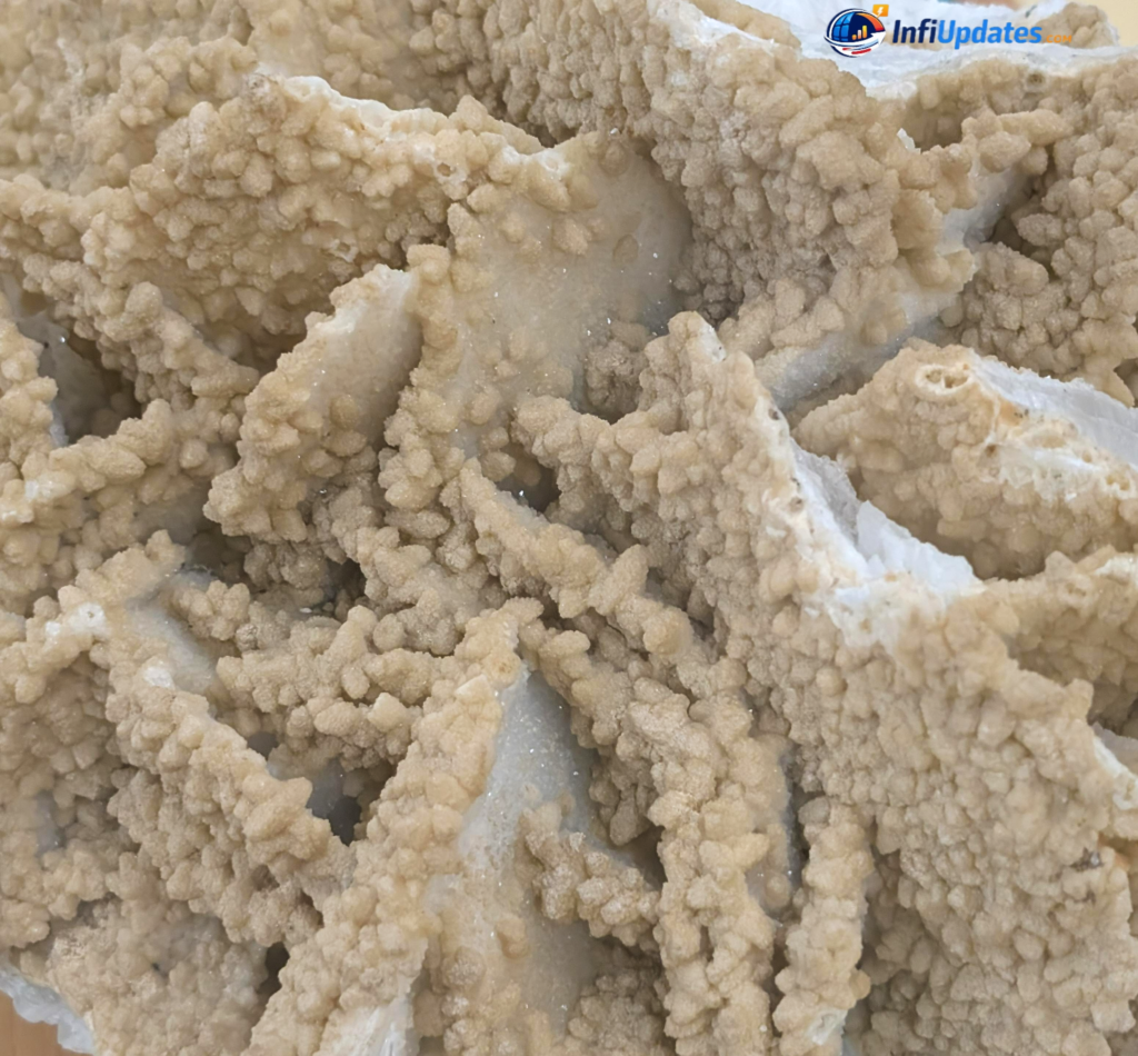 Gypsum is a soft sulfate mineral made of calcium sulfate dihydrate. It forms when mineral-rich water evaporates, leaving crystalline deposits behind. In desert regions, especially in dried lakebeds known as playas, gypsum can accumulate in significant quantities.
